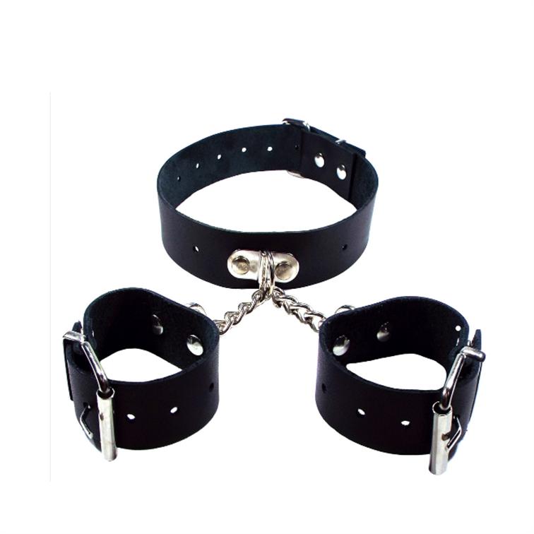 Collar con esposas de cuero y cadena. Con una sujeción increíble gracias a que cuenta con varias medidas para ajustarse tanto al cuello como a las muñecas.